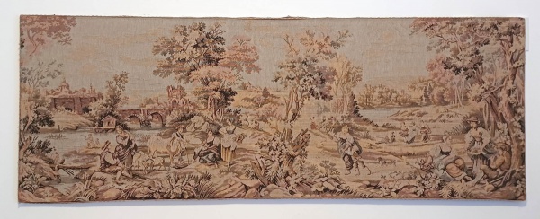 Bela e antiga tapeçaria, executada em gobelin, retratando cenas campestres. Mede 179 x 66 cm