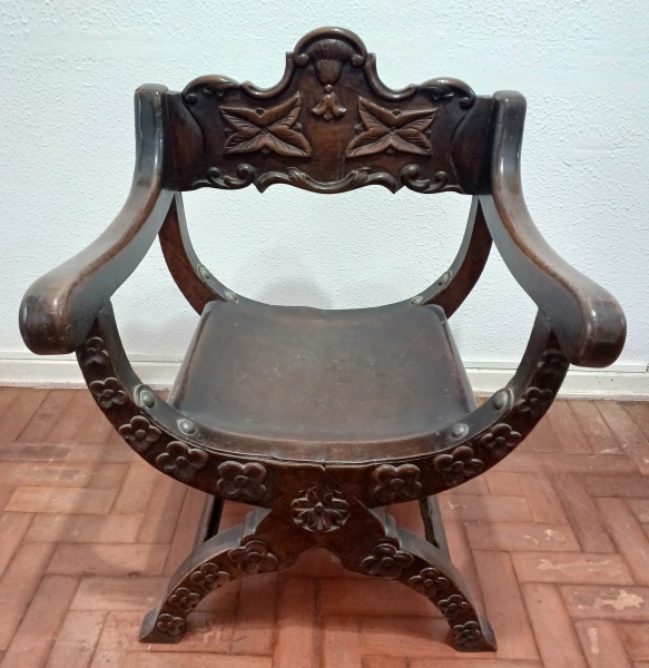 Antiga cadeira, estilo rústico, estruturada em madeira, entalhada no encosto e no frontispício, com assento em couro e tacheados. Medidas: 89 (A) x ...