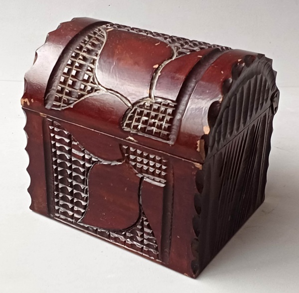 Baú de madeira envernizada e entalhada. Apresenta pequenos desgastes. Medidas: 14 x 11 x 13 (A) cm