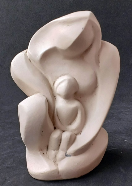 Escultura estilizada, em gesso, representando maternidade. Mede 17 (A) x 12 x 10 cm