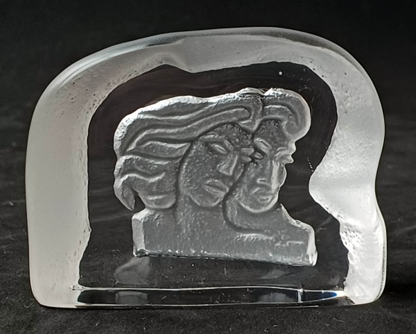 Bloco de cristal com figura de casal em jateamento. Mede 8,5 x 3 x 6,5 (A)