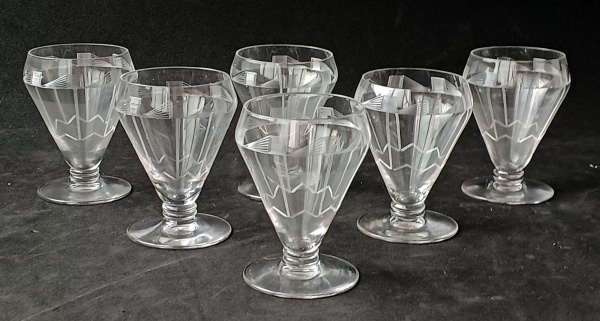 Seis taças para vinho do porto, em cristal translúcido lapidado em baixo relevo com motivos geométricos. Medidas: 8,5 (A) x 5,5 cm de diâmetro da boca