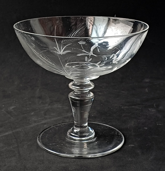 Compoteira estilo taça, de cristal, decorada com motivos florais, jato de areia e lapidação. Medidas: 14,5 (A) x 15,5 de diâmetro da boca