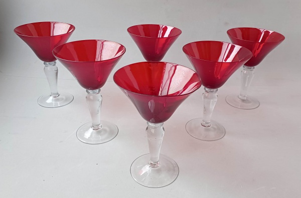 Seis taças de champanhe vermelhas. Uma das taças apresenta um leve bicado na borda. Medidas: 17 (A) x 12 cm de diâmetro da boca
